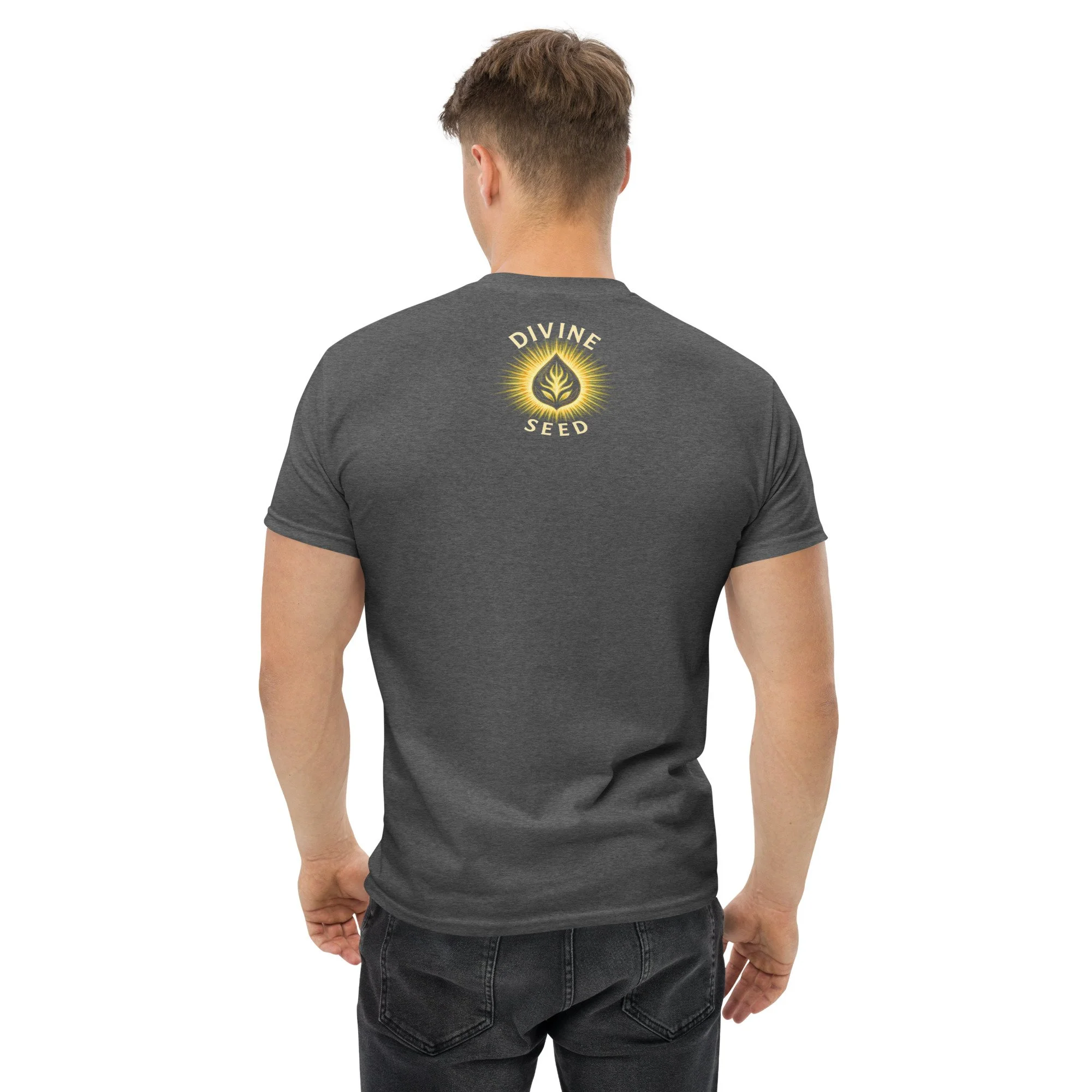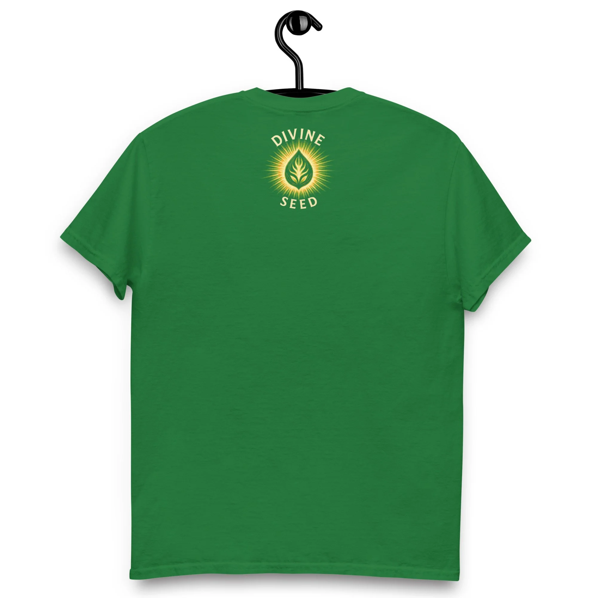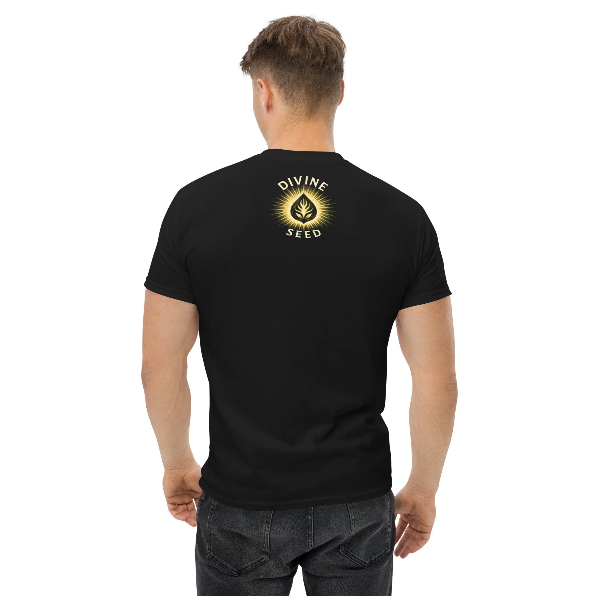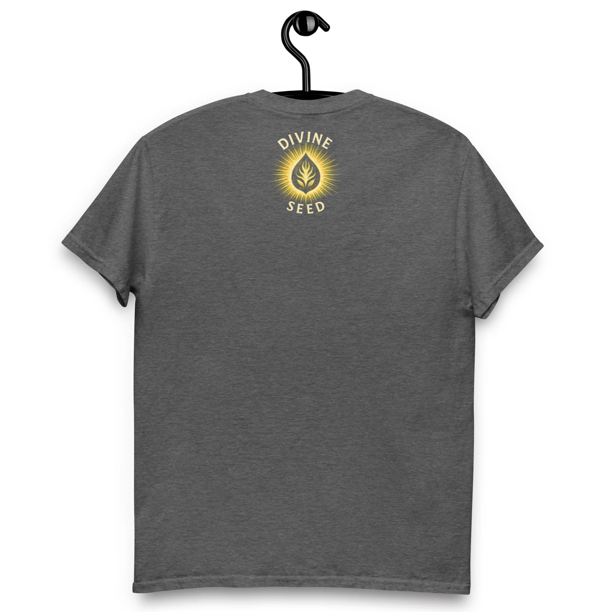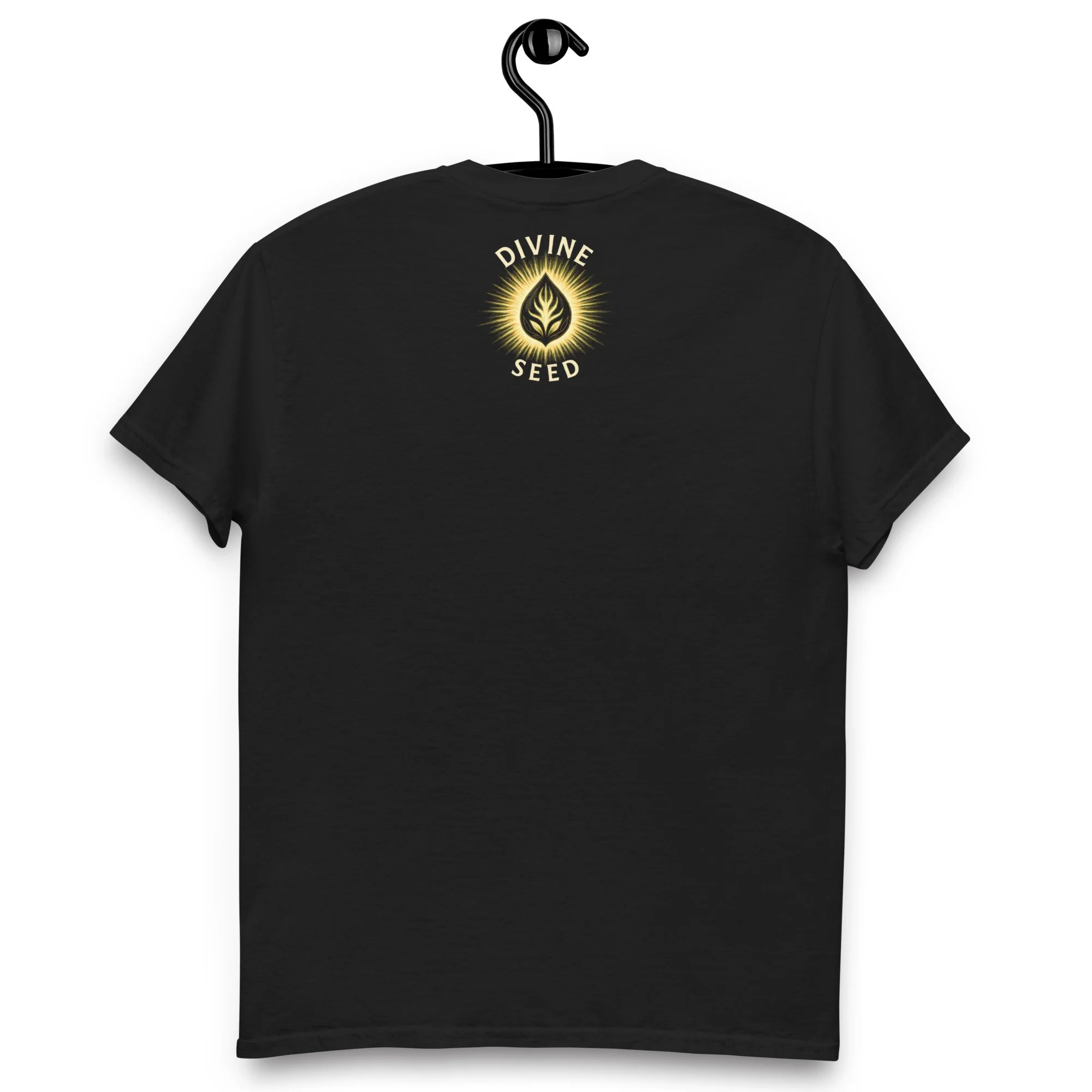 The back of the shirt carries the radiant Divine Seed emblem — a reminder that even in the darkest battles, the power of light and creation burns within. This glowing seed also appears on the back of the tag, symbolizing resilience, rebirth, and inner strength.