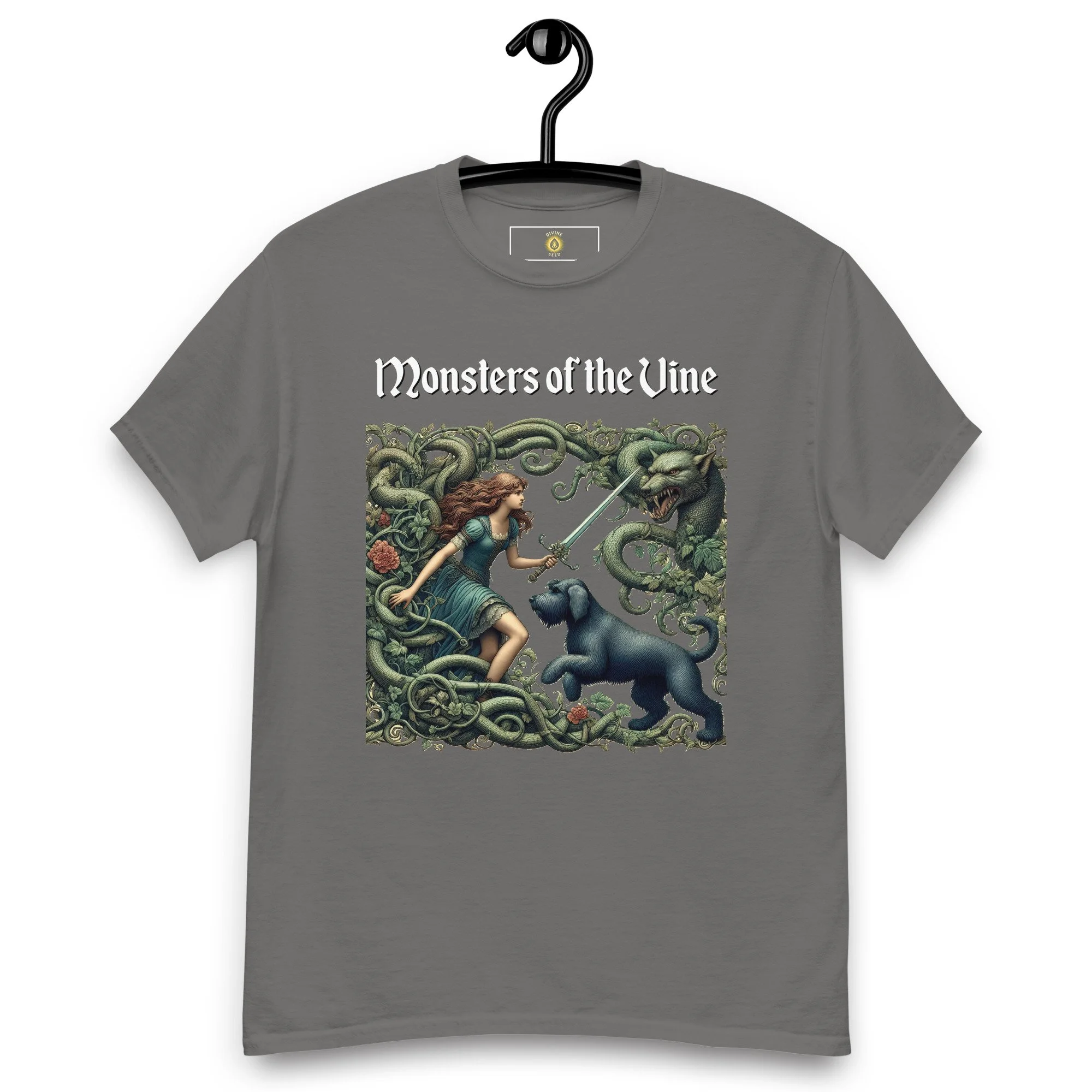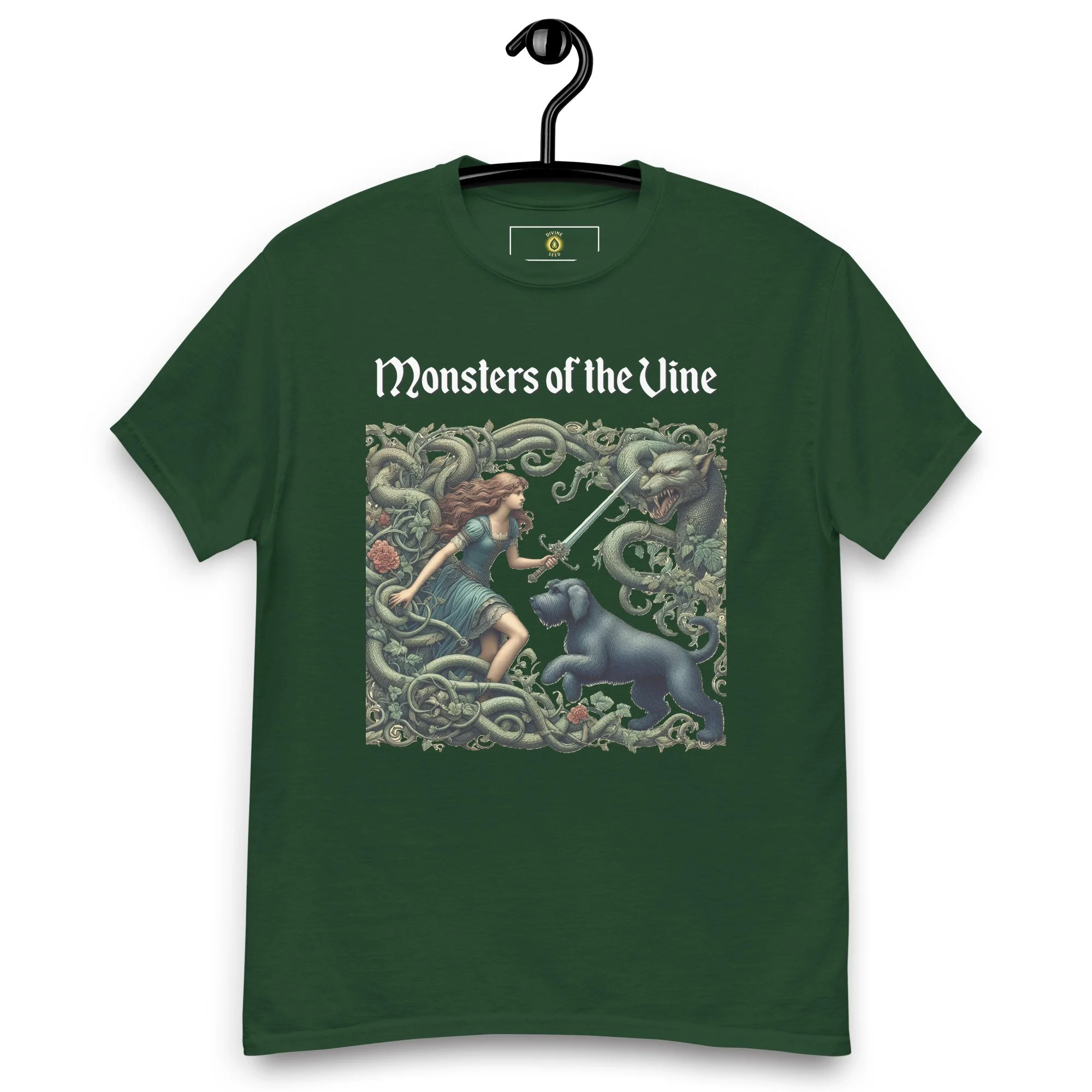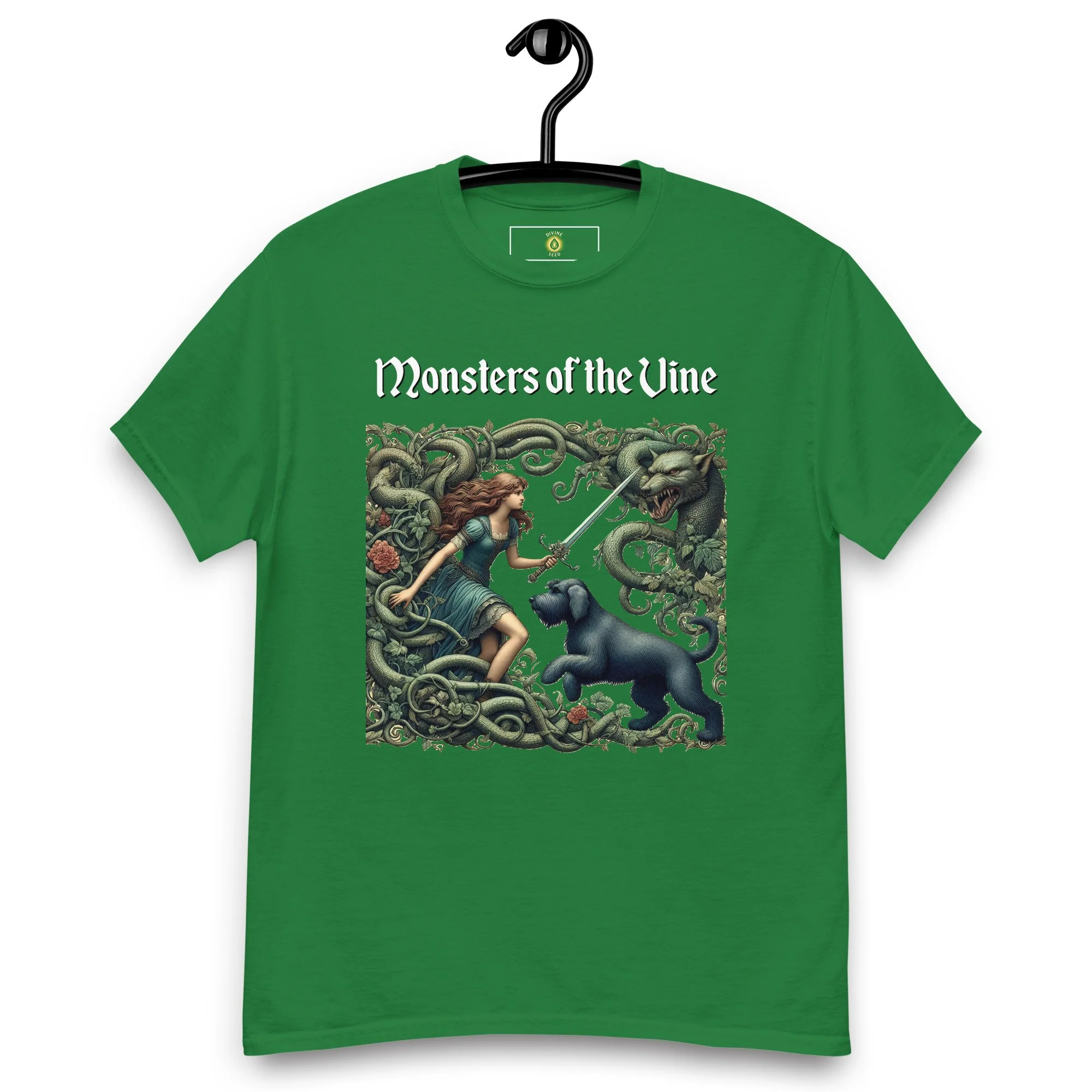 Step into the mythic battle between fear and courage with the Monsters of the Vine tee. On the front, Isabella stands defiant with her sword, facing the monstrous forces born from the twisting vines of Monsterville. At her side, a loyal companion stands ready for the fight.