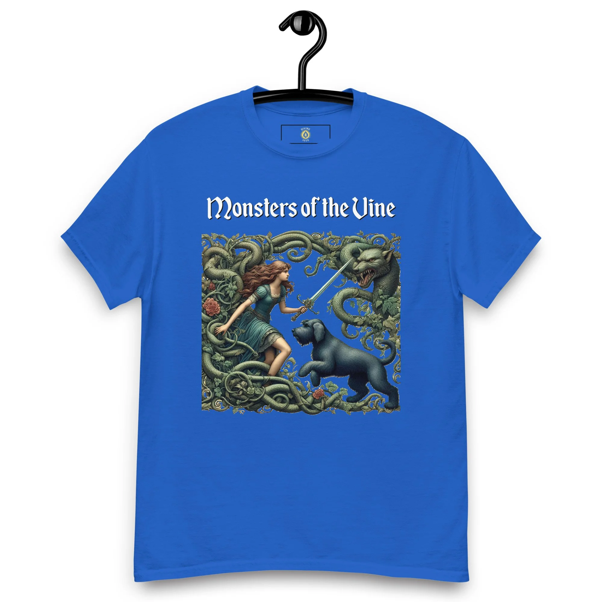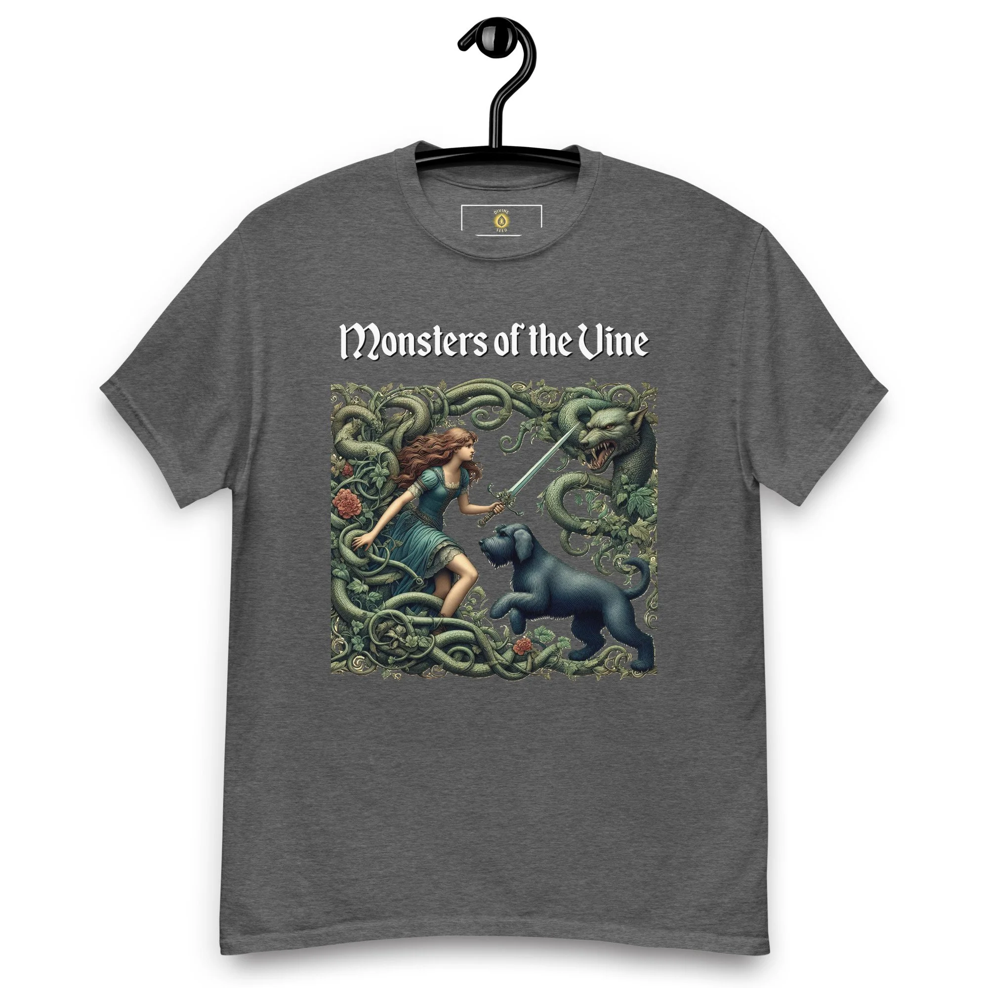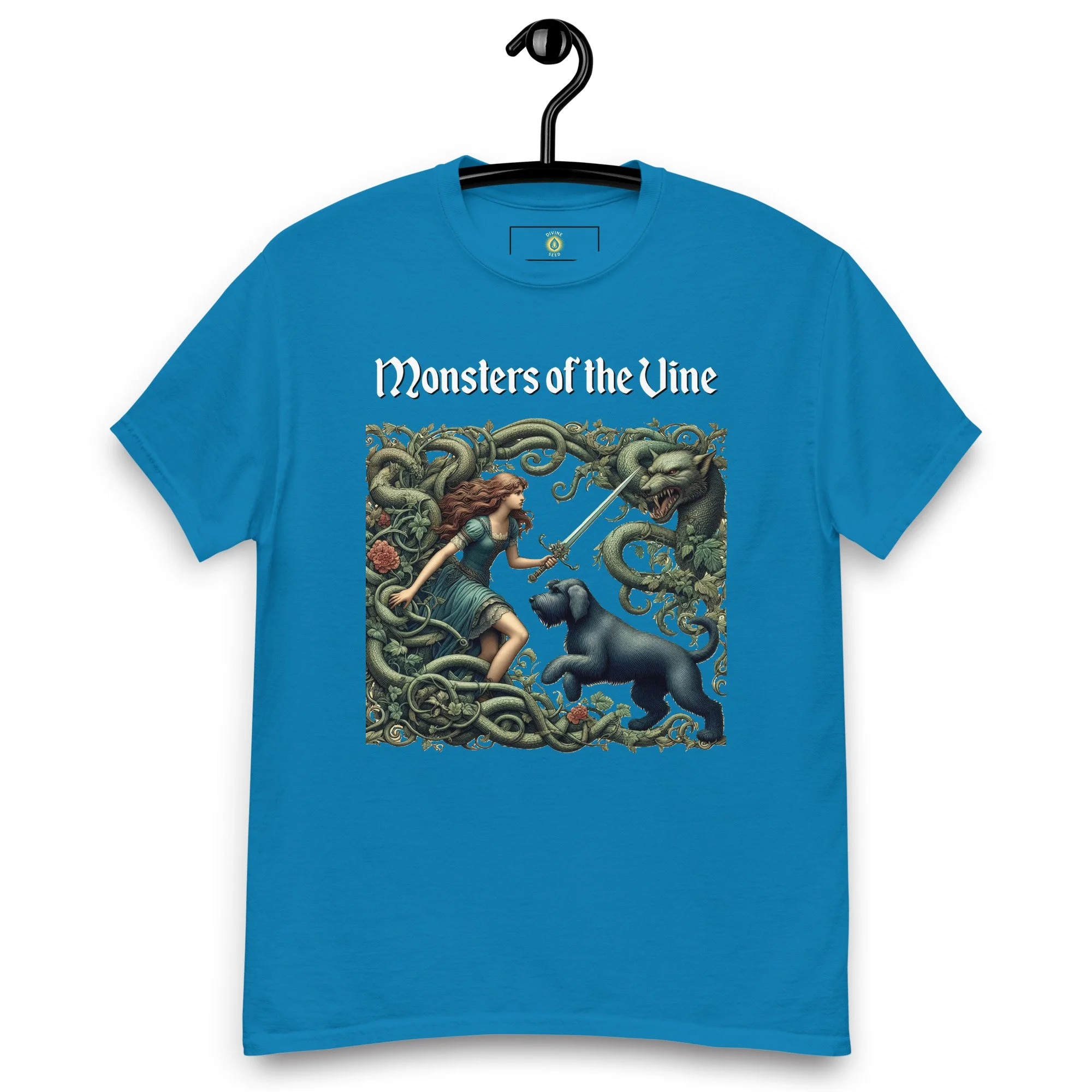 Step into the mythic battle between fear and courage with the Monsters of the Vine tee. On the front, Isabella stands defiant with her sword, facing the monstrous forces born from the twisting vines of Monsterville. At her side, a loyal companion stands ready for the fight.